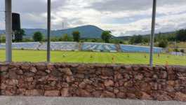 Naprzeciwko trybuny wschodniej znajduje się zachodnia trybuna prosta. Jest ona znacznie większa od trybuny wschodniej (szacuję, że liczy ona jakieś 2-2,5 tysiąca miejsc siedzących) i nie jest ona aktualnie użytkowana w trakcie meczów (a przynajmniej nie w trakcie dzisiejszego). Mimo to, trybuna wygląda jakby była w całkiem niezłym stanie - są na niej wszystkie krzesełka, a te białe tworzą na tle jasnoniebieskich napis GÓRNIK . Na jednym z ciągów komunikacyjnych jest też wymalowany herb Górnika. Na trybunie nie ma żadnego zadaszenia. Co ciekawe, w trakcie meczu pojawiło się na niej kilkanaście osób, ale nie wiem w jaki sposób się tam znalazły (w każdym razie, wszystko wskazuje, że nie płaciły one za wstęp). Z innych informacji na temat stadionu - znajduje się na nim niezbyt imponująca tablica wyników (pozwalająca na wyświetlanie jedynie wyniku i czasu), za to nie ma na nim sztucznego oświetlenia. Zaskoczyło mnie, że przed meczem nie była puszczana żadna muzyka - nie wiem czy to jest tutaj standard, czy jednorazowy przypadek, w każdym razie przywitałem ten fakt z ulgą (muzyka puszczana na stadionach z reguły należy do gatunków o działaniu kancerogennym).