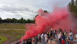 Na północnym skraju trybuny, gdzie nie ma krzesełek (nie robi to wielkiej różnicy, ponieważ fanatycy z reguły i tak oglądają mecz na stojąco) ulokował się młyn kibiców Górnika, który zrobił połowę całej frekwencji na dzisiejszym meczu. Kibice na początek rozwinęli na płocie jedynie długi transparent upamiętniający Powstanie Warszawskie (jakieś dłuższe hasło na tle biało-czerwonej flagi, ale przyznam, że nie doczytałem jego treści). Kibice trochę podopingowali, po czym gdzieś w okolicach 13. minuty usłyszałem jakiś okrzyk z młyna ... pełne cztery zwrotki! i już wiedziałem o co chodzi. Kibice zaczęli śpiewać Mazurka Dąbrowskiego, a piknik również powstał i zaczął śpiewać (co prawda niezbyt głośno, bardziej jak pieśń w kościele). Odpalono czerwone świece dymne, a zapewne również i białe (zapewne , bo z mojej perspektywy było widać akurat jedynie kolor czerwony).