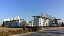 W końcu docieramy w tym opisie do właściwej areny dzisiejszego spotkania. A była nią... hala z pełnowymiarowym boiskiem. I to nie żadna hala pneumatyczna (tzw. balon ) - otóż naddniestrzańscy oligarchowie z koncernu Sheriff dosłownie postawili sobie budynek mieszczący pełnowymiarowe boisko. I jest to naprawdę imponująca konstrukcja. Z zewnątrz wygląda ona... po prostu dziwnie, gdybym nie wiedział co jest w środku, wziąłbym ją zapewne za lodowisko (prawdopodobnie za sprawą niebieskiego dachu, który powoduje pewien przekaz podprogowy ). Ciekawiej jest jednak od wewnątrz. Przede wszystkim, mamy tutaj boisko (pełnowymiarowe - pamiętacie jeszcze), które pokryte jest naturalnie sztuczną murawą, podobno najwyższej jakości. Boisko otoczone jest z trzech stron trybunami - wzdłuż linii bocznych znajdują się dwie trybuny proste, na których znajduje się siedem rzędów krzesełek. Trybuny są jakieś 5 metrów od linii bocznej, dzięki czemu wszystko bardzo dobrze z nich widać. Szkoda tylko, że nie są one podniesione względem poziomu boiska - pierwszy rząd znajduje się na wysokości murawy. Dosyć zabawny jest fakt, że między boiskiem a trybuną mieszczą się jeszcze... ławki rezerwowych. Są one dosyć skromne i zapewne niewygodne - co więcej, siedzących na nich piłkarzy oddzielają od widzów jedynie niskie barierki (ale nie sądzę, że piłkarzom mogłoby coś zagrażać, bo poza standardowymi ochroniarzami na meczu było także kilku ludzi wyglądających jak naddniestrzańscy wojskowi). W sumie, siedzenia na hali również są raczej niewygodne - są to metalowe składane krzesełka, takie jakie czasem instaluje się na sektorach stojących, kiedy przy okazji jakiejś imprezy międzynarodowej przerabia się je tymczasowo na siedzące.