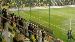 W drugiej połowie przeniosłem się na szczyt trybuny zabramkowej. Stwierdziłem, że chciałbym zobaczyć mecz z perspektywy nieco wyżej położonego miejsca, a poza tym chyba już dzwoniło w uszach od krzyku wspomnianych w poprzednim akapicie dziewczynek. Nie brałem udziału w dopingu, jak zresztą większość ludzi zasiadających na trybunie zabramkowej (jak wspomniałem, dopingiem zajmowała się 30-40 osobowa grupa i była ona ulokowana pośrodku trybuny, w dolnych rzędach). Im bliżej było końca meczu, tym więcej ludzi stopniowo zwalniała swoje miejsca i kierowała się do wyjścia - i nie musiałem nawet za bardzo ich obserwować, ponieważ w zasadzie za każdym razem metalowe krzesełko zajmowane przez taką osobę składało się z głośnym brzdękiem, który niósł się po całej hali.
